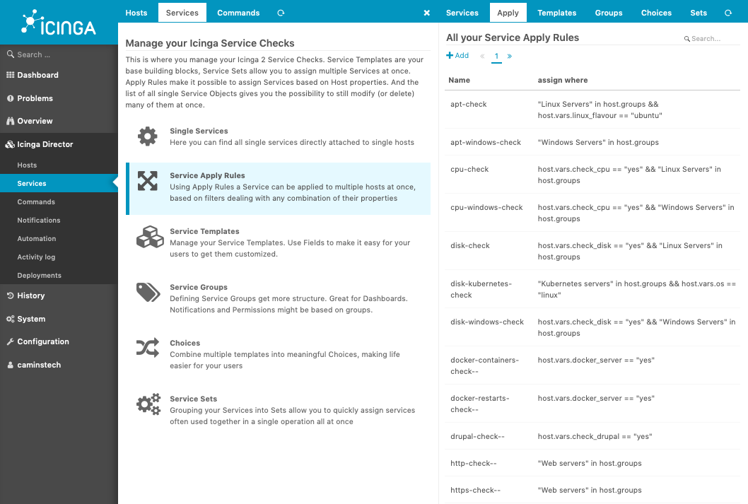 Els serveis s'estructuren de forma similar als hosts. Quan es crea un servei cal que heredi d'una Service template, que és on es defineix el Command que executarà el check i on també es defineixen un conjunt de variables que serviran per parametritzar cada instància del servei. Quan creem un Single Service seleccionem el host on s'aplicarà el check i el service template que utilitzarà, posant els valors concrets per aquell servei. En canvi, si creem una Service apply rule definim una regla per seleccionar el grup de hosts sobre la que s'aplicarà el check, i també definim d'on s'agafaran els valors concrets de cada variable per generar cada instància de servei (recordem que cal indicar els valors que hem definit a la service template). En la regla es pot definir que per les variables multivalor es crei un servei per cadascun d'ells. Per exemple, si tenim un host amb una variable multivalor com HTTPS hosts en que hi ha les webs hostatjades en aquell host, podem definir una regla que per cadascun dels hosts que siguin servidor web (identificats per la variable Web server?) es crei un servei de check de la web per cadascun dels HTTPS hosts que s'hagin definit en el servidor.