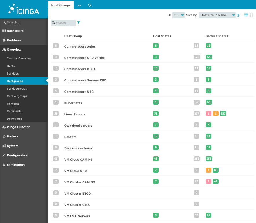 Actualment estem monitoritzant 149 hosts i 741 serveis. Entre la tipologia de hosts s'hi inclouen servidors físics, servidors virtuals, virtualitzadores, contenidors docker, switchs de xarxa i SAIs.